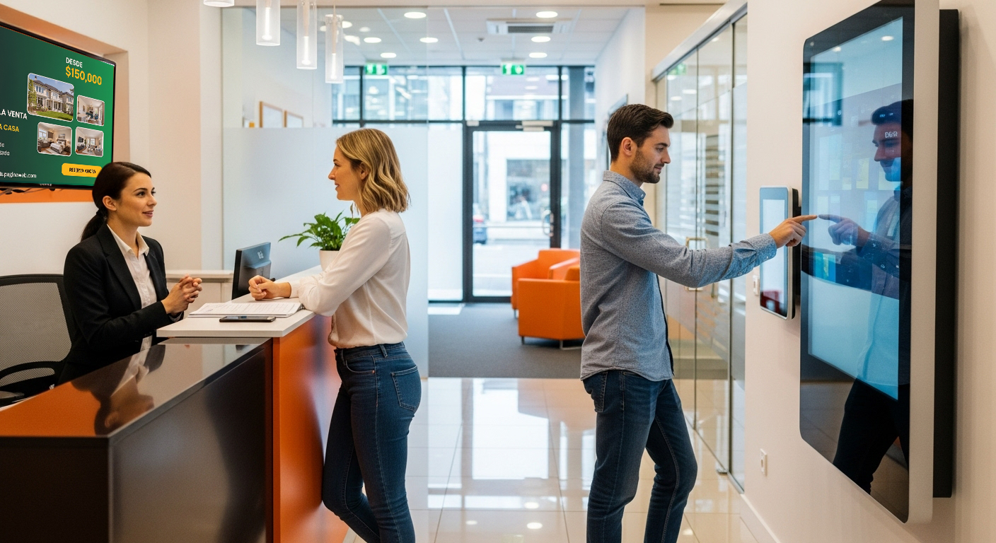 Se trata del uso de pantallas conectadas a un software especializado que permite mostrar listados de propiedades, videos en alta resolución y perfiles de asesores, mejorando la experiencia de los clientes y optimizando la operación diaria.